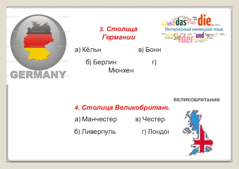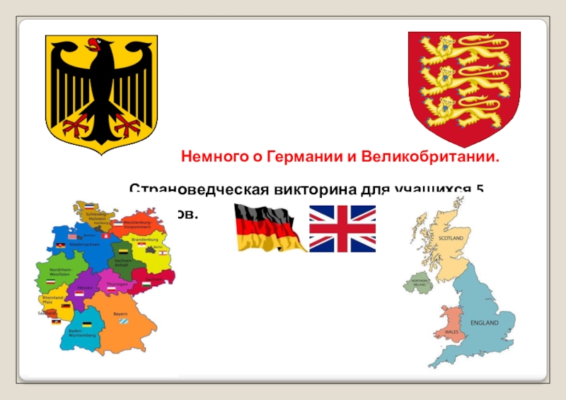 Презентация, доклад на тему Страноведческая викторина для учеников 5 -в класса, изучающих немецкий и английский языки.