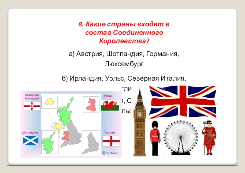 8. Какие страны входят в состав Соединенного Королевства?а) Австрия, Шотландия, Германия, Люксембург б) Ирландия, Уэльс, Северная Италия,