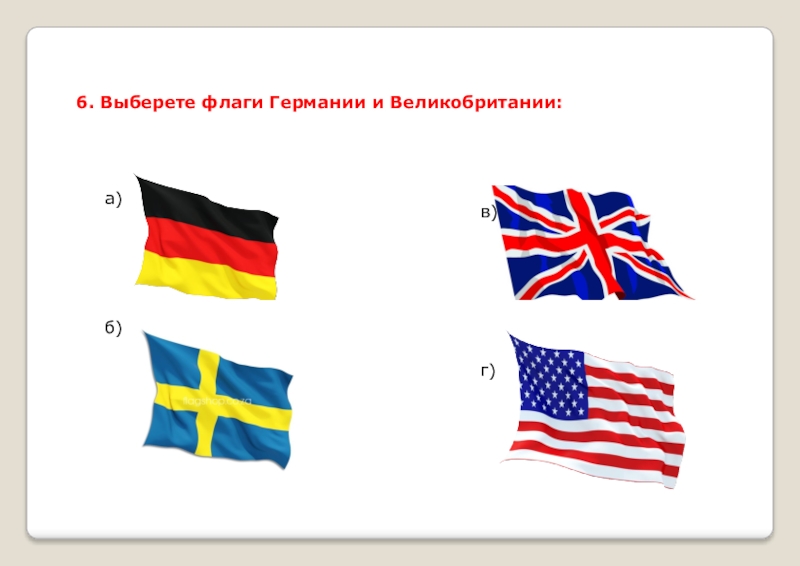 6. Выберете флаги Германии и Великобритании:а)б)в)г)