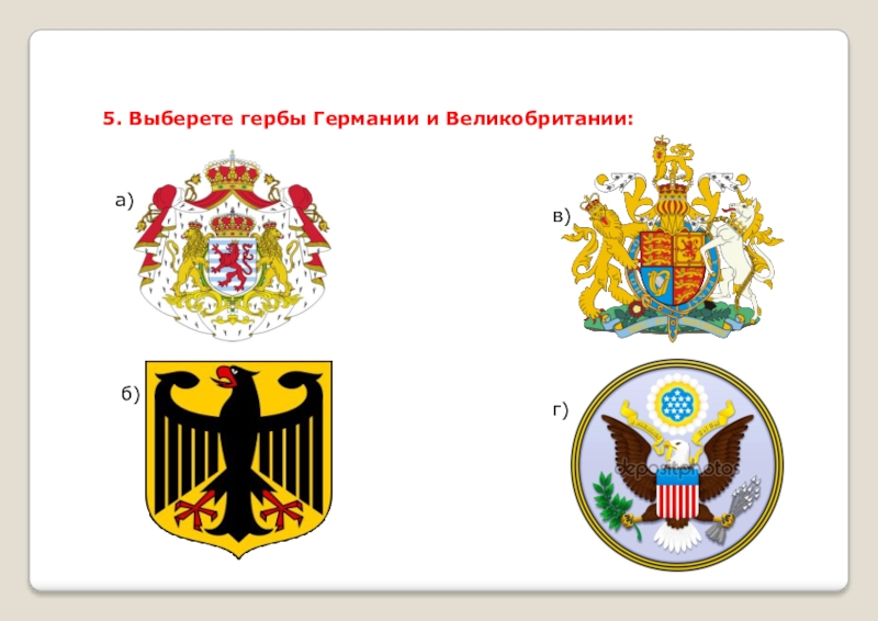 5. Выберете гербы Германии и Великобритании:а)б)в)г)