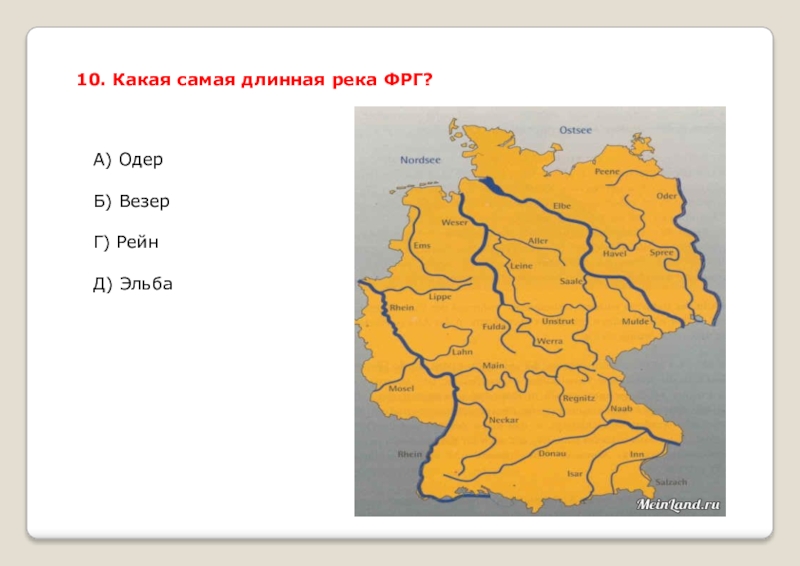 10. Какая самая длинная река ФРГ?А) ОдерБ) ВезерГ) РейнД) Эльба