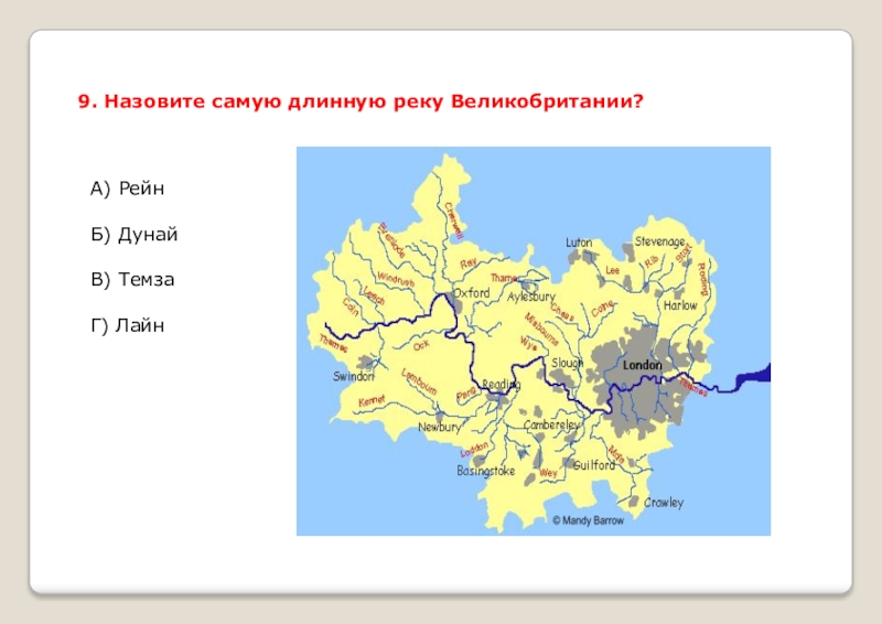 9. Назовите самую длинную реку Великобритании?А) РейнБ) ДунайВ) ТемзаГ) Лайн