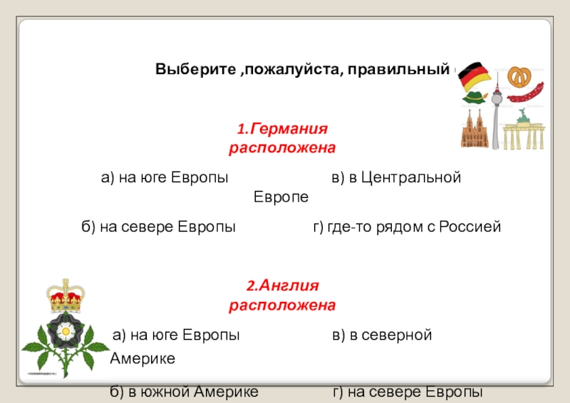 Выберите ,пожалуйста, правильный ответ.1.Германия расположенаа) на юге Европы в) в Центральной Европеб) на севере Европы