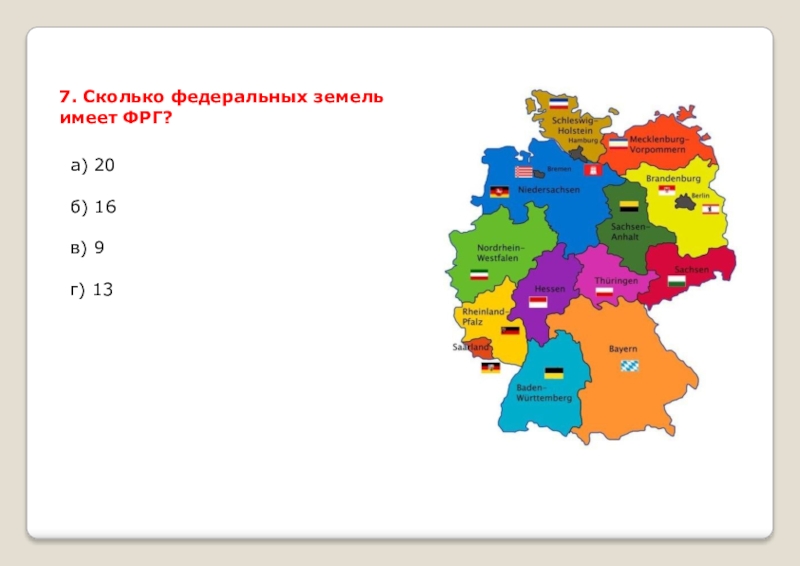 7. Сколько федеральных земель имеет ФРГ?а) 20б) 16в) 9г) 13