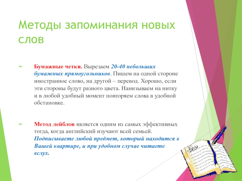 одной стороне иностранное слово, на другой – перевод. Хорошо, если эти стороны будут разного цвета. Нанизываем на нитку и в любой удобный момент повторяем слова в удобной обстановке.