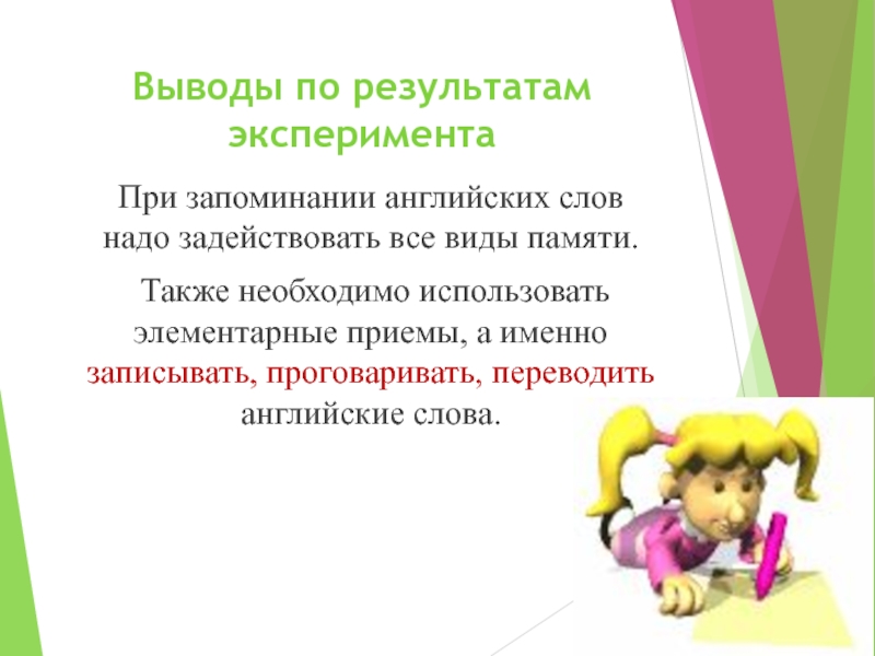 Также необходимо использовать элементарные приемы, а именно записывать, проговаривать, переводить английские слова.