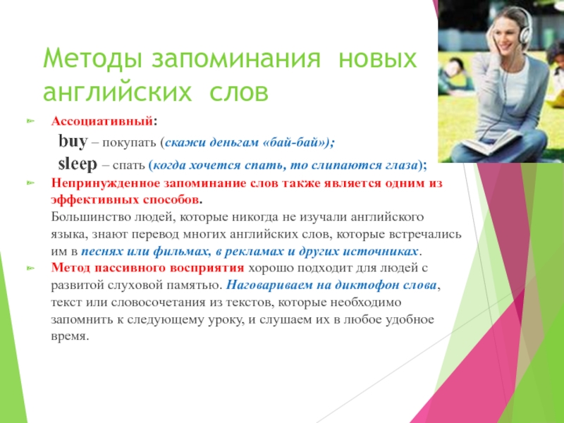 Метод пассивного восприятия хорошо подходит для людей с развитой слуховой памятью. Наговариваем на диктофон слова, текст или словосочетания из текстов, которые необходимо запомнить к следующему уроку, и слушаем их в любое удобное время.