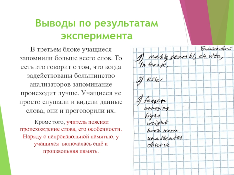 То есть это говорит о том, что когда задействованы большинство анализаторов запоминание происходит лучше. Учащиеся не просто слушали и видели данные слова, они и проговорили их.