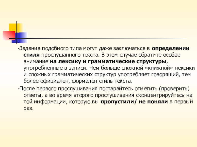 -Если в задании требуется определить, к какому типу текстов принадлежат прослушанные отрывки , обратите внимание на выражения и обороты, характерные для данного типа текста(например, для телефонного разговора, и т.п.) Часто достаточно услышать 1-2 выражения, чтобы правильно выполнить задание.