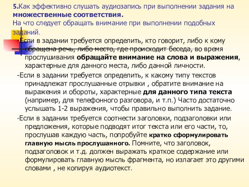 -Если в задании требуется соотнести заголовки, подзаголовки или предложения, которые подводят итог текста или его части, то, прослушав каждую часть, попробуйте кратко сформулировать главную мысль прослушанного. Помните, что заголовок, подзаголовок и т.д. должен выражать краткое содержание или формулировать главную мысль фрагмента, но излагает это другими словами , не копируя аудиотекст.