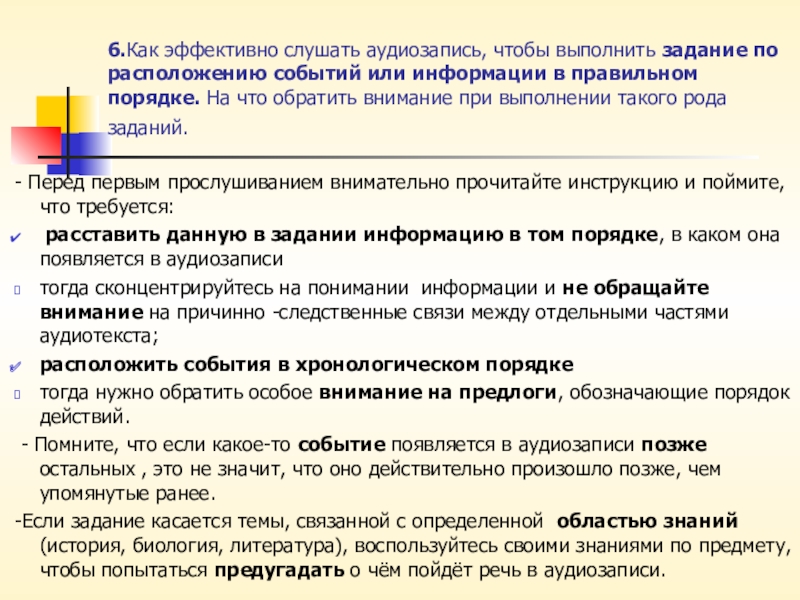 расставить данную в задании информацию в том порядке, в каком она появляется в аудиозаписи