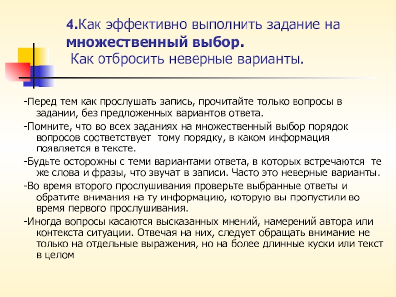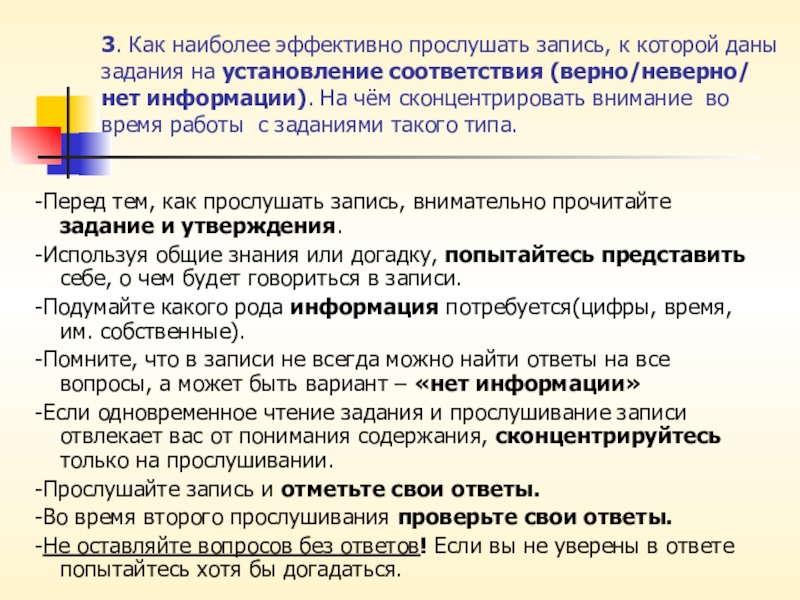 -Если одновременное чтение задания и прослушивание записи отвлекает вас от понимания содержания, сконцентрируйтесь только на прослушивании.