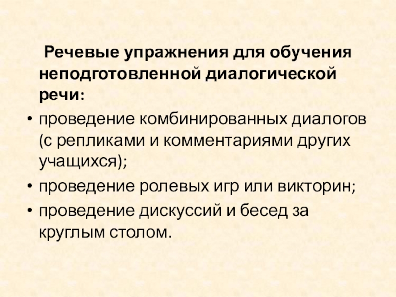 Речевые упражнения для обучения неподготовленной диалогической речи:проведение комбинированных диалогов (с репликами и комментариями других учащихся);проведение ролевых игр