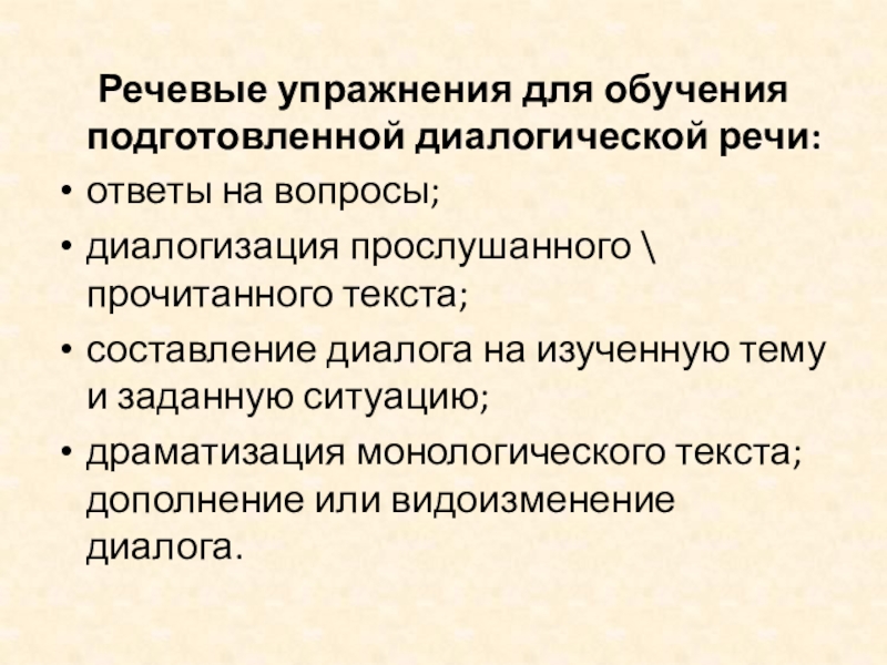 Речевые упражнения для обучения подготовленной диалогической речи:ответы на вопросы;диалогизация прослушанного \ прочитанного текста;составление диалога на изученную тему