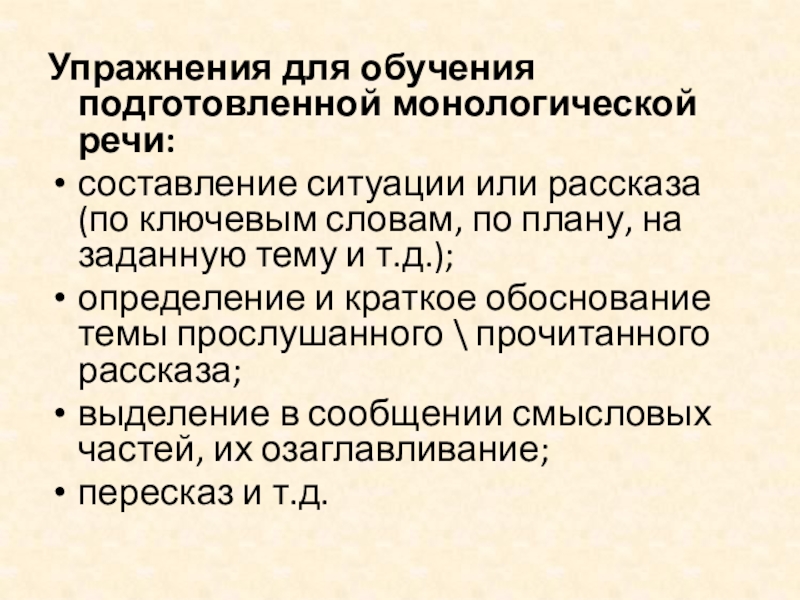 Упражнения для обучения подготовленной монологической речи:составление ситуации или рассказа (по ключевым словам, по плану, на заданную тему