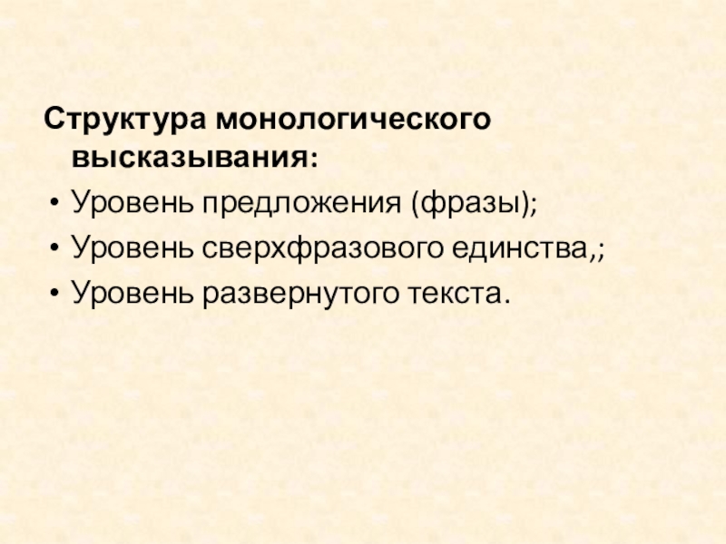 Структура монологического высказывания:Уровень предложения (фразы);Уровень сверхфразового единства,;Уровень развернутого текста.