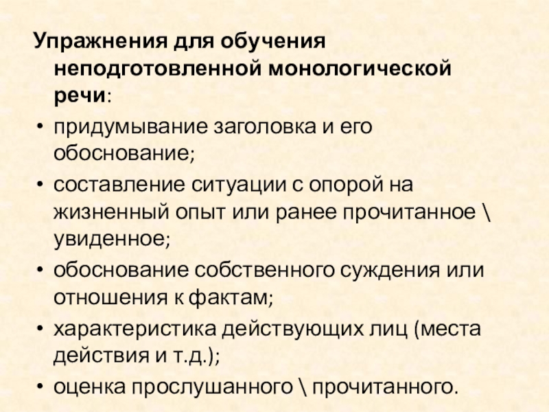 Упражнения для обучения неподготовленной монологической речи:придумывание заголовка и его обоснование;составление ситуации с опорой на жизненный опыт или