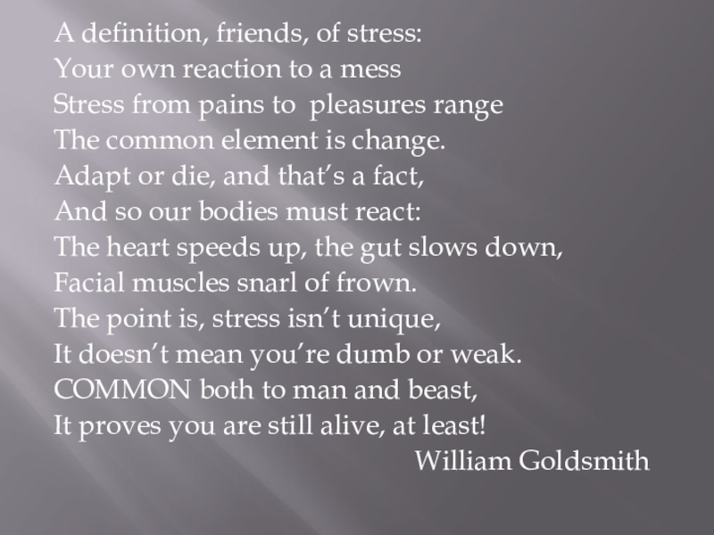 A definition, friends, of stress:Your own reaction to a messStress from pains to pleasures rangeThe common element