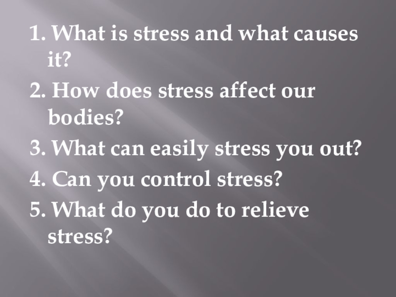 1. What is stress and what causes it?2. How does stress affect our bodies?3. What can easily stress you out?4. Can you control stress?5. What do you do to relieve stress?