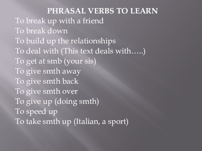 PHRASAL VERBS TO LEARNTo break up with a friendTo break downTo build up the relationshipsTo deal with