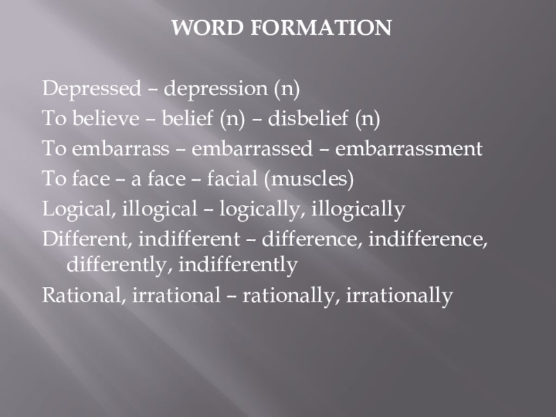 WORD FORMATIONDepressed – depression (n)To believe – belief (n) – disbelief (n)To embarrass – embarrassed – embarrassmentTo