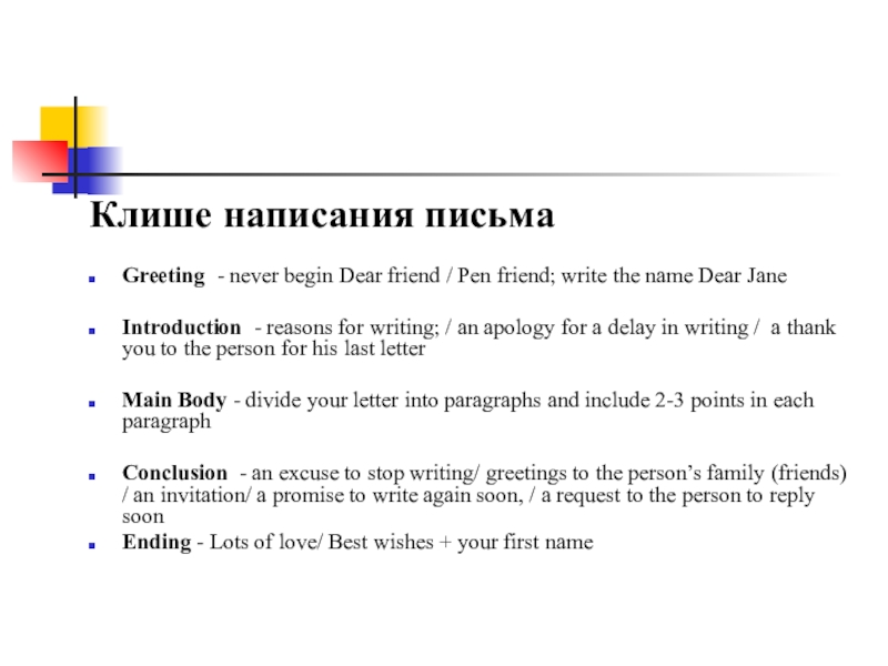 Conclusion - an excuse to stop writing/ greetings to the person’s family (friends) / an invitation/ a promise to write again soon, / a request to the person to reply soon
