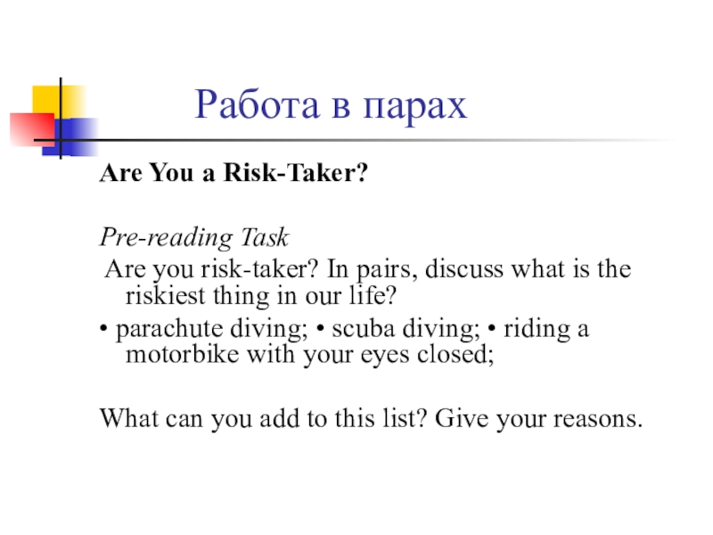 Are you risk-taker? In pairs, discuss what is the riskiest thing in our life?