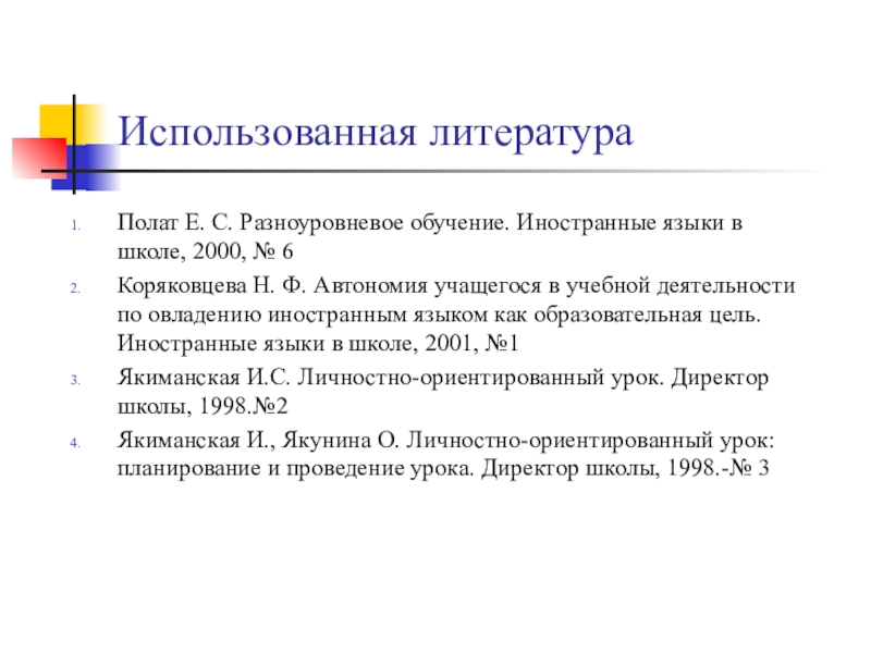 Коряковцева Н. Ф. Автономия учащегося в учебной деятельности по овладению иностранным языком как образовательная цель. Иностранные языки в школе, 2001, №1