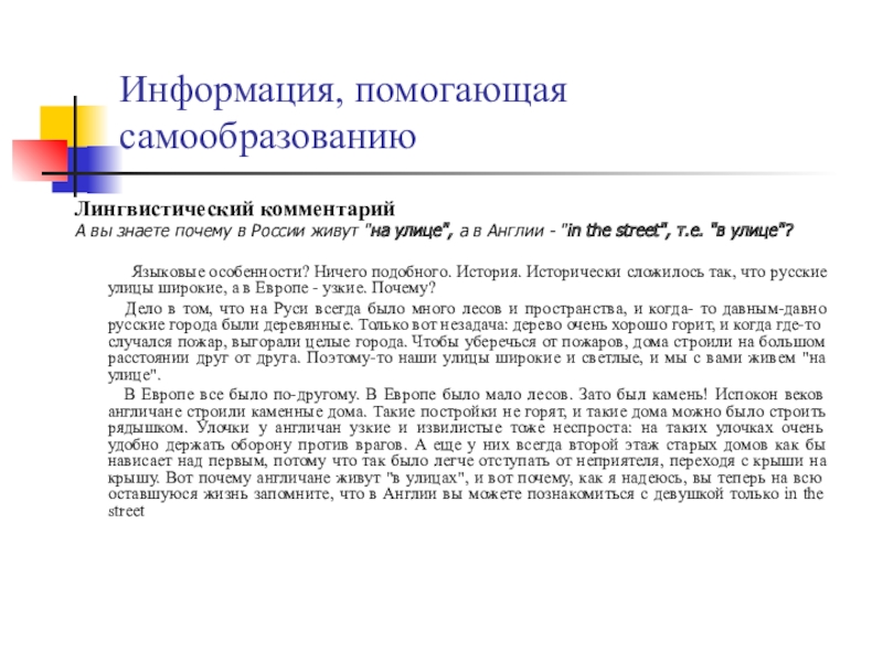 В Европе все было по-другому. В Европе было мало лесов. Зато был камень! Испокон веков англичане строили каменные дома. Такие постройки не горят, и такие дома можно было строить рядышком. Улочки у англичан узкие и извилистые тоже неспроста: на таких улочках очень удобно держать оборону против врагов. А еще у них всегда второй этаж старых домов как бы нависает над первым, потому что так было легче отступать от неприятеля, переходя с крыши на крышу. Вот почему англичане живут "в улицах", и вот почему, как я надеюсь, вы теперь на всю оставшуюся жизнь запомните, что в Англии вы можете познакомиться с девушкой только in the street