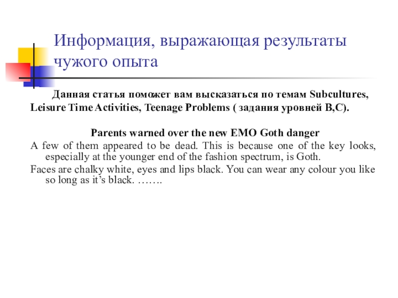 выражающая результаты чужого опыта (описательные тексты) Выраженные в них знания могут быть восприняты учениками по-разному, т.е. они не обезличены