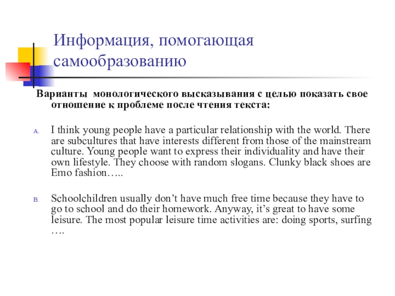 Текст должен содержать информацию, помогающую самообразованию. Этому способствуют пояснения, указания, комментарии, смысловые таблицы, облегчающие субъектную обработку текста, его понимание