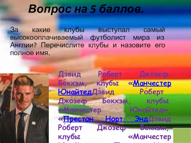 Дэ́вид Ро́берт Джо́зеф Бе́кхэм, клубы «Манчестер ЮнайтедДэ́вид Ро́берт Джо́зеф Бе́кхэм, клубы «Манчестер Юнайтед», «Престон Норт ЭндДэ́вид Ро́берт Джо́зеф Бе́кхэм, клубы «Манчестер Юнайтед», «Престон Норт Энд», «Реал МадридДэ́вид Ро́берт Джо́зеф Бе́кхэм, клубы «Манчестер Юнайтед», «Престон Норт Энд», «Реал Мадрид», «МиланДэ́вид Ро́берт Джо́зеф Бе́кхэм, клубы «Манчестер Юнайтед», «Престон Норт Энд», «Реал Мадрид», «Милан», «Лос-Анджелес ГэлаксиДэ́вид Ро́берт Джо́зеф Бе́кхэм, клубы «Манчестер Юнайтед», «Престон Норт Энд», «Реал Мадрид», «Милан», «Лос-Анджелес Гэлакси» и «Пари Сен-ЖерменДэ́вид Ро́берт Джо́зеф Бе́кхэм, клубы «Манчестер Юнайтед», «Престон Норт Энд», «Реал Мадрид», «Милан», «Лос-Анджелес Гэлакси» и «Пари Сен-Жермен», а также защищал цвета сборной Англии