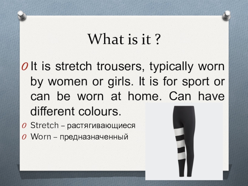 What is it ?It is stretch trousers, typically worn by women or girls. It is for sport