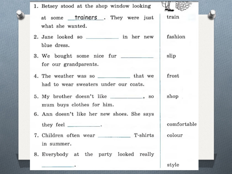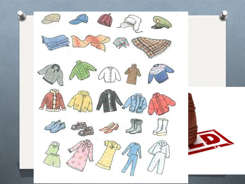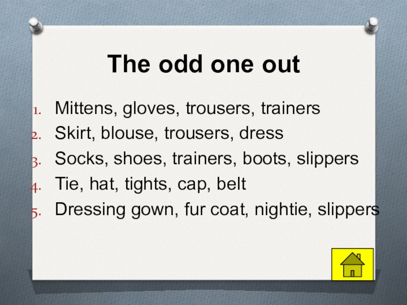 The odd one out Mittens, gloves, trousers, trainers Skirt, blouse, trousers, dressSocks, shoes, trainers, boots, slippersTie, hat, tights, cap, beltDressing gown, fur coat, nightie, slippers