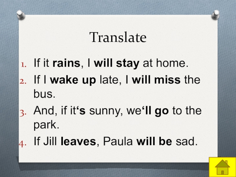 Translate If it rains, I will stay at home.If I wake up late, I will miss the bus.And, if it‘s sunny, we‘ll go to the park.If Jill leaves, Paula will be sad.