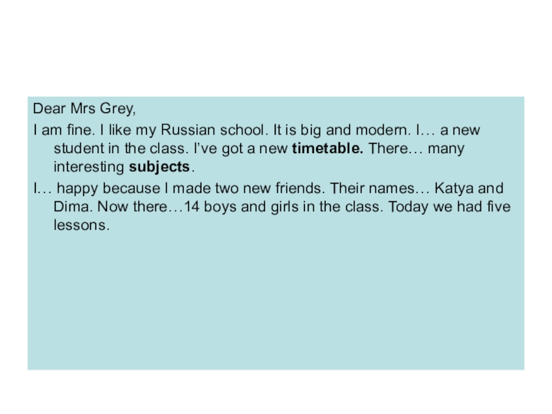 Dear Mrs Grey,I am fine. I like my Russian school. It is big and modern. I… a