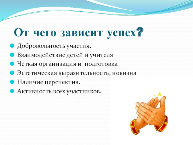 От чего зависит успех? Добровольность участия.Взаимодействие детей и учителя Четкая организация и подготовка Эстетическая выразительность, новизна