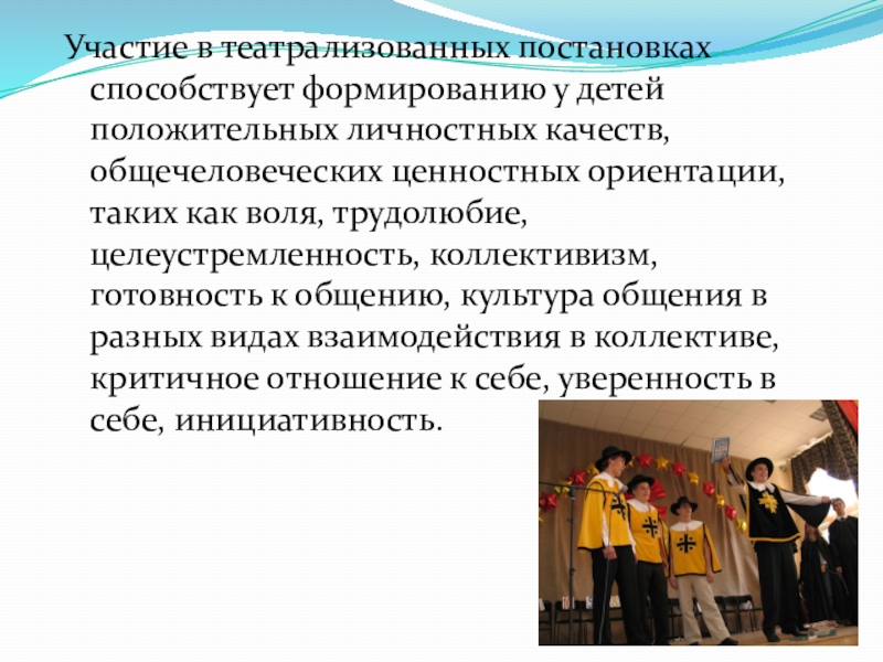 Участие в театрализованных постановках способствует формированию у детей положительных личностных качеств, общечеловеческих ценностных ориентации, таких как воля, трудолюбие, целеустремленность, коллективизм, готовность к общению, культура общения в разных видах взаимодействия в коллективе, критичное отношение к себе, уверенность