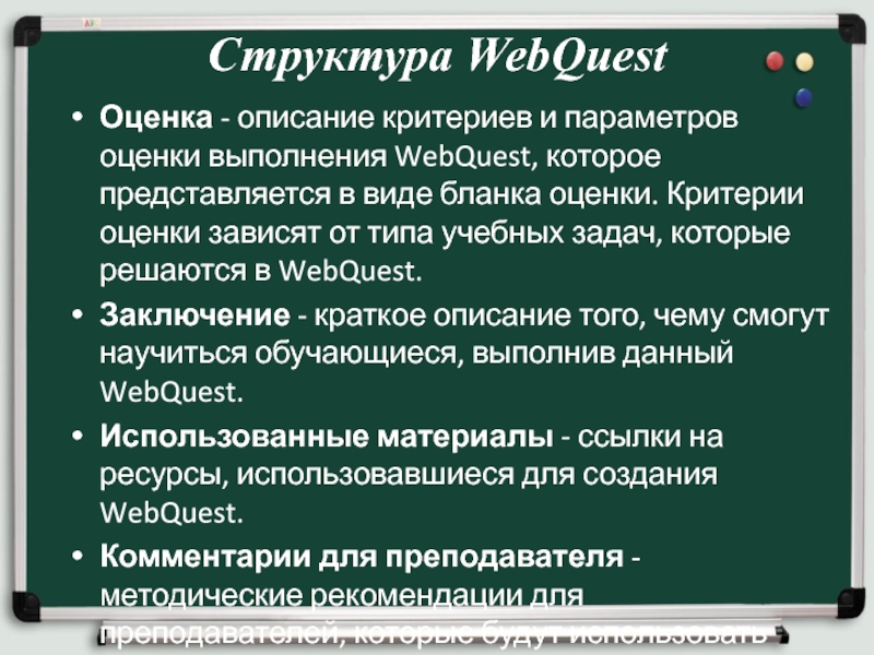представляется в виде бланка оценки. Критерии оценки зависят от типа учебных задач, которые решаются в WebQuest.