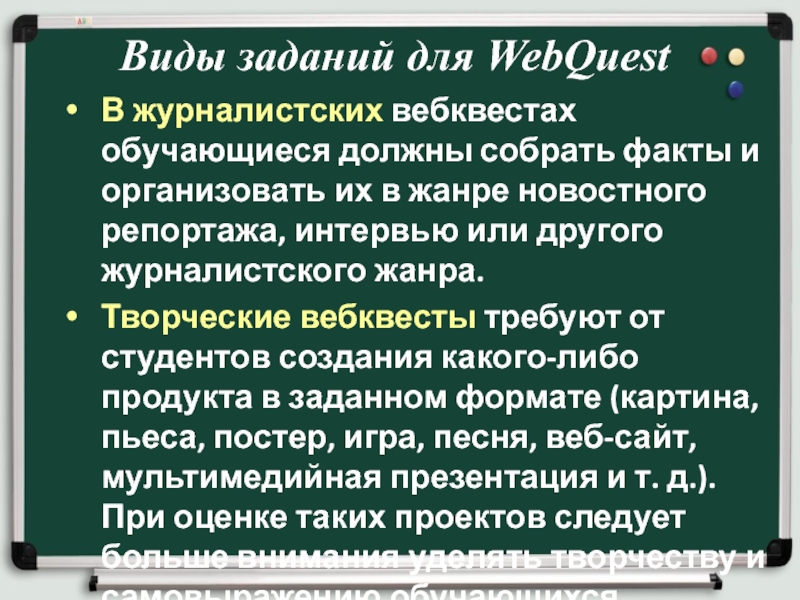 Творческие вебквесты требуют от студентов создания какого-либо продукта в заданном формате (картина, пьеса, постер, игра, песня, веб-сайт, мультимедийная презентация и т. д.). При оценке таких проектов следует больше внимания уделять творчеству и самовыражению обучающихся.