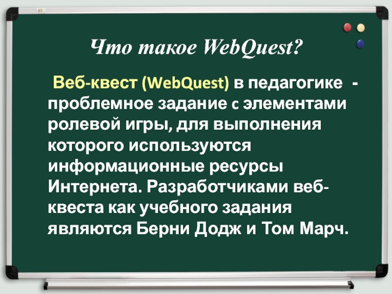 ролевой игры, для выполнения которого используются информационные ресурсы Интернета. Разработчиками веб-квеста как учебного задания являются Берни Додж и Том Марч.