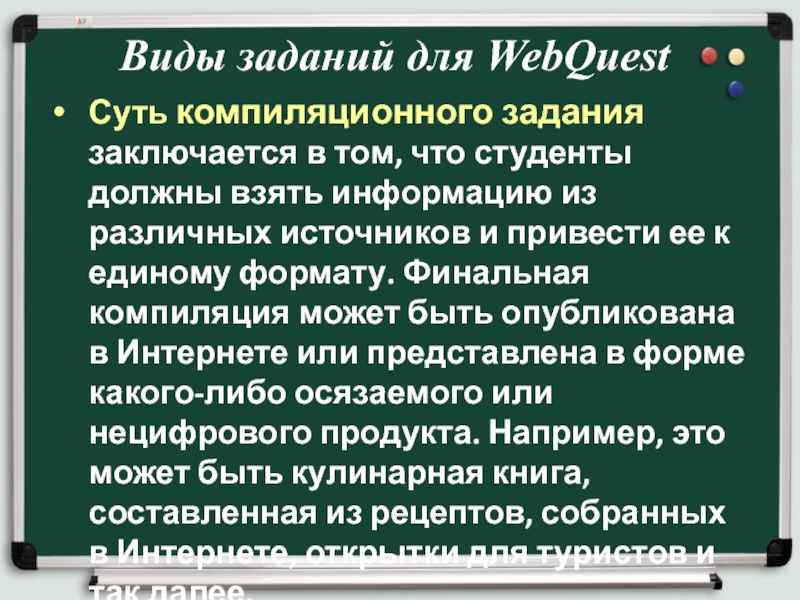 должны взять информацию из различных источников и привести ее к единому формату. Финальная компиляция может быть опубликована в Интернете или представлена в форме какого-либо осязаемого или нецифрового продукта. Например, это может быть кулинарная книга, составленная из рецептов, собранных в Интернете, открытки для туристов и так далее.