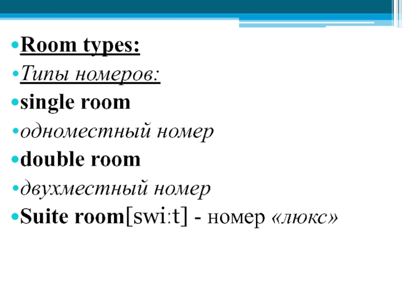 Room types:Типы номеров:single roomодноместный номерdouble roomдвухместный номерSuite room[swiːt] - номер «люкс»