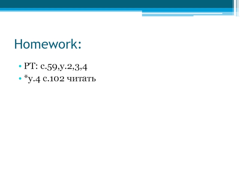 Homework:РТ: с.59,у.2,3,4*у.4 с.102 читать