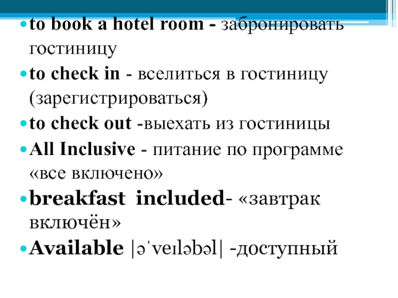 to book a hotel room - забронировать гостиницуto check in - вселиться в гостиницу (зарегистрироваться)to check out