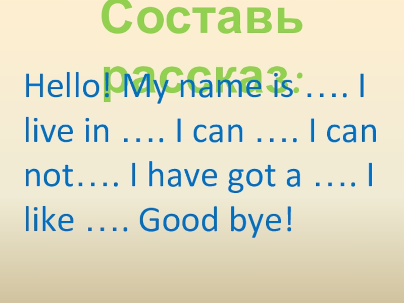 Составь рассказ: Hello! My name is …. I live in …. I can …. I can not….