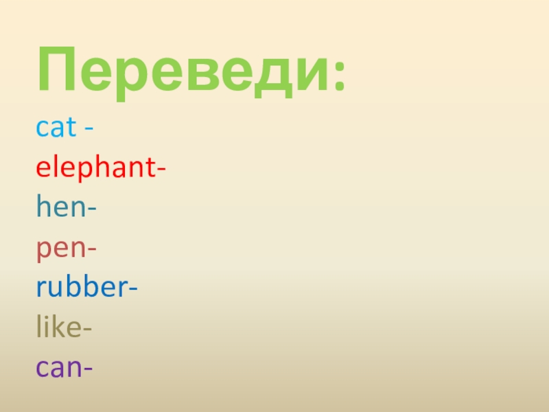 Слайд 1Переведи: cat - elephant- hen- pen- rubber- like- can-