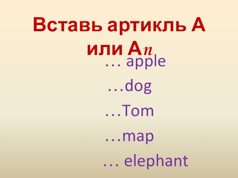 Вставь артикль А или Аn  … apple…dog…Tom…map    … elephant