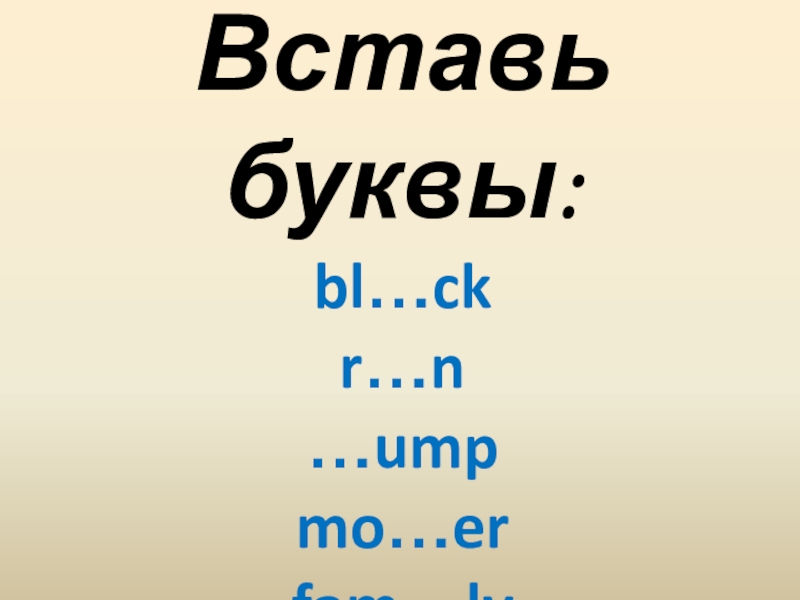 Слайд 2 Вставь буквы: bl…ck r…n …ump mo…er fam…ly