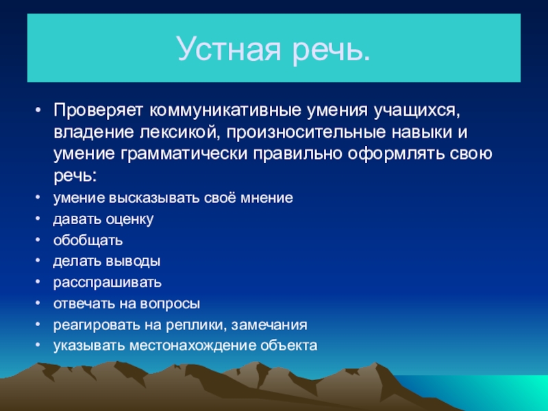 Проверяет коммуникативные умения учащихся, владение лексикой, произносительные навыки и умение